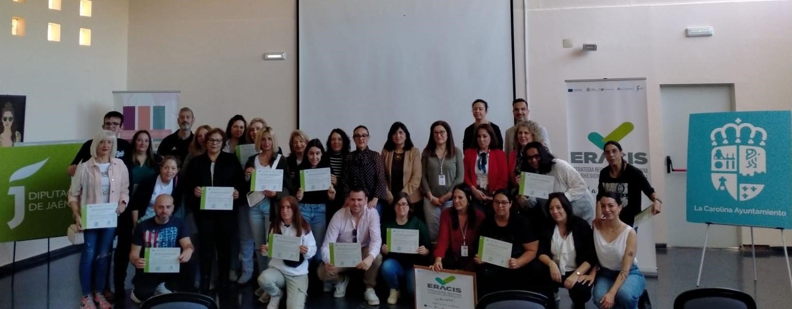 Foto de familia de participantes en los cursos desarrollados en La Carolina, profesorado y autoridades
